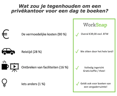 De vermoedelijke kosten zijn de voornaamste reden om niet te kiezen voor het boeken van een privékantoor voor een dag. Gelukkig kunnen wij bij WorkSnap hier een oplossing bieden!