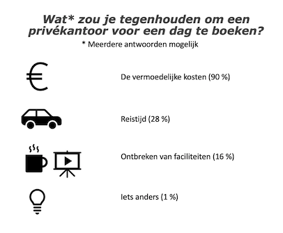 Voor ruim een kwart zou reistijd hun tegen kunnen houden. Het missen van bepaalde werkplek faciliteiten is voor sommigen een reden geen privékantoor te boeken.